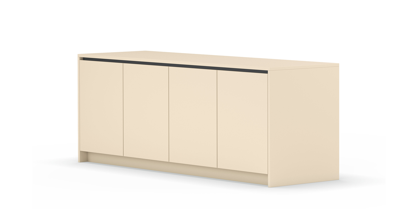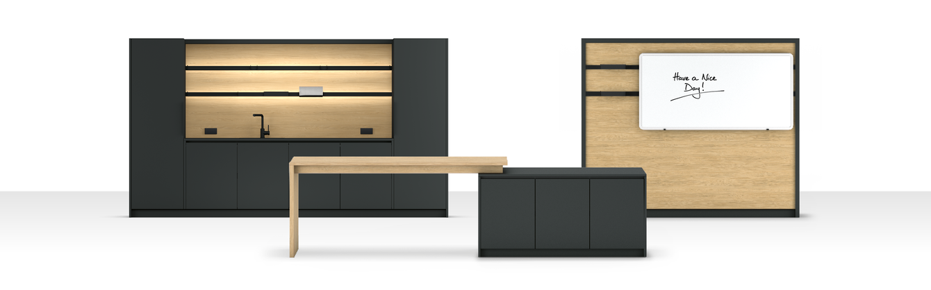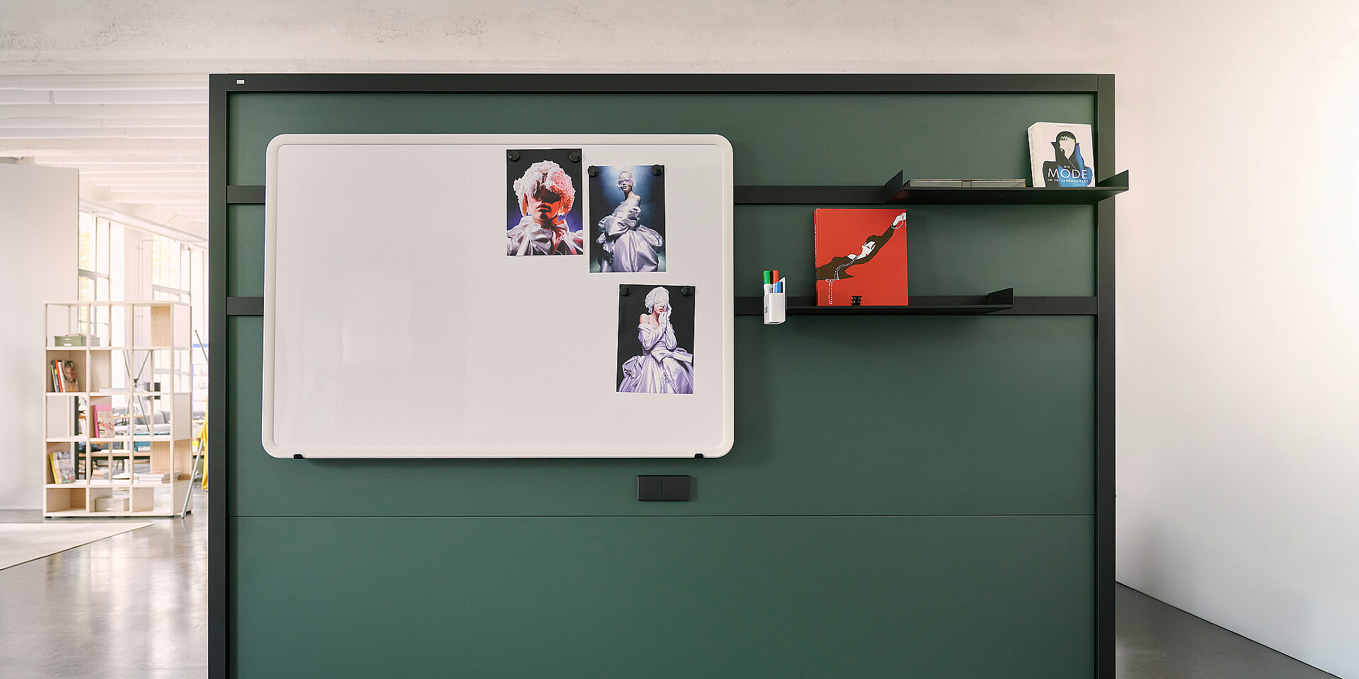 Modules can be installed without the need for tall cabinets against a wall or wall placement, and can also be used as free-standing room dividers. When used in this way, the back panel can be fitted with functional rails for hanging whiteboards and other accessories. A monitor can also be mounted.