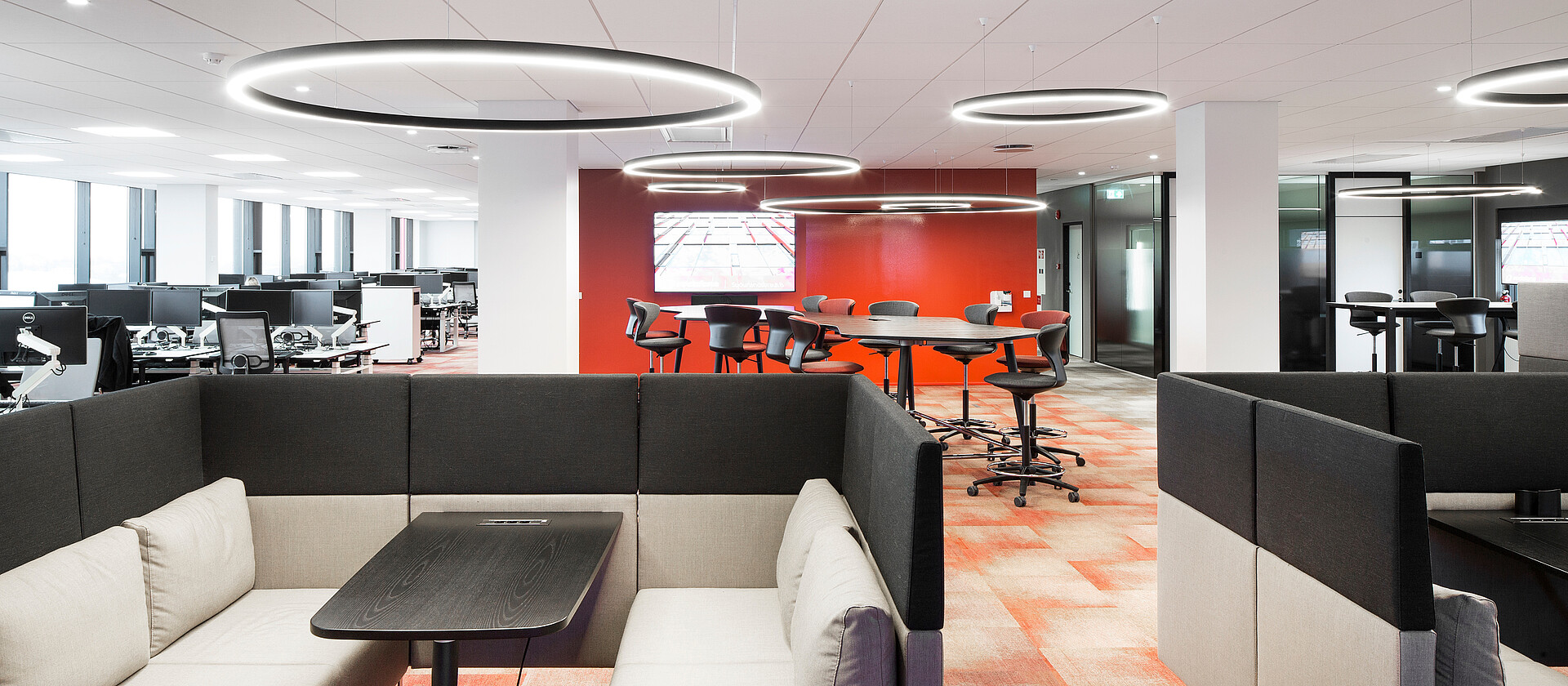 Kantine, Besprechungsräume, WeSpace: Auf drei Etagen hat Vodafone seine Büroräume in Reykjavik neu eingerichtet. Bei der Gestaltung spielt das Vodafone-Rot eine ebenso wichtige Rolle wie kulturelle Einflüsse. Die Möbel sind darauf abgestimmt und fügen sich in das Gesamtbild harmonisch ein.
