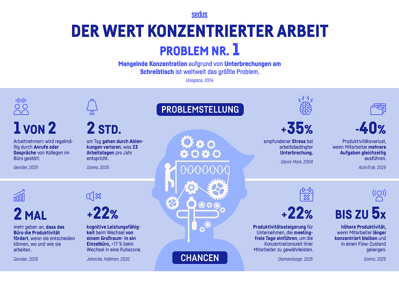 „Das größte Missverständnis der letzten Büro-Dekade ist der Glaube, Konzentration sei einfach ‚weniger Lärm‘. Die Forschung zeigt allerdings klar: Menschen verlieren Fokus nicht wegen Geräuschen – sondern weil sie keine Kontrolle über ihr Umfeld haben“, sagt Ernst Holzapfel, Marketing-Direktor bei Sedus. „In einer Zeit, in der sich Arbeit über viele Orte verteilt, braucht das Büro eine klare Aufgabe. Die Neurowissenschaft belegt, dass mehr als vier Stunden echte Konzentration biologisch kaum möglich sind. Wenn wir diese Zeit im Büro verlieren, verliert das Unternehmen seine wertvollste Energiequelle.“