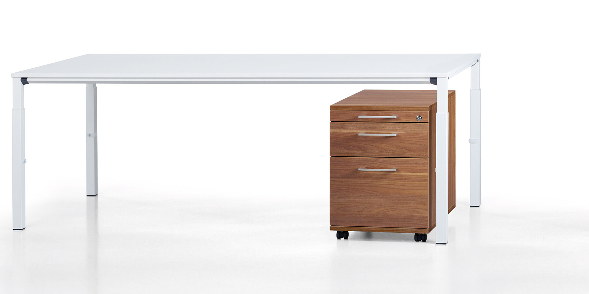 Für die Beistellcontainer gibt es höheneinstellbare Gleiter mit Ausgleichselementen für die Anpassung an die Tischhöhe. Mit Rollen wird der Container zur mobilen Arbeitseinheit.