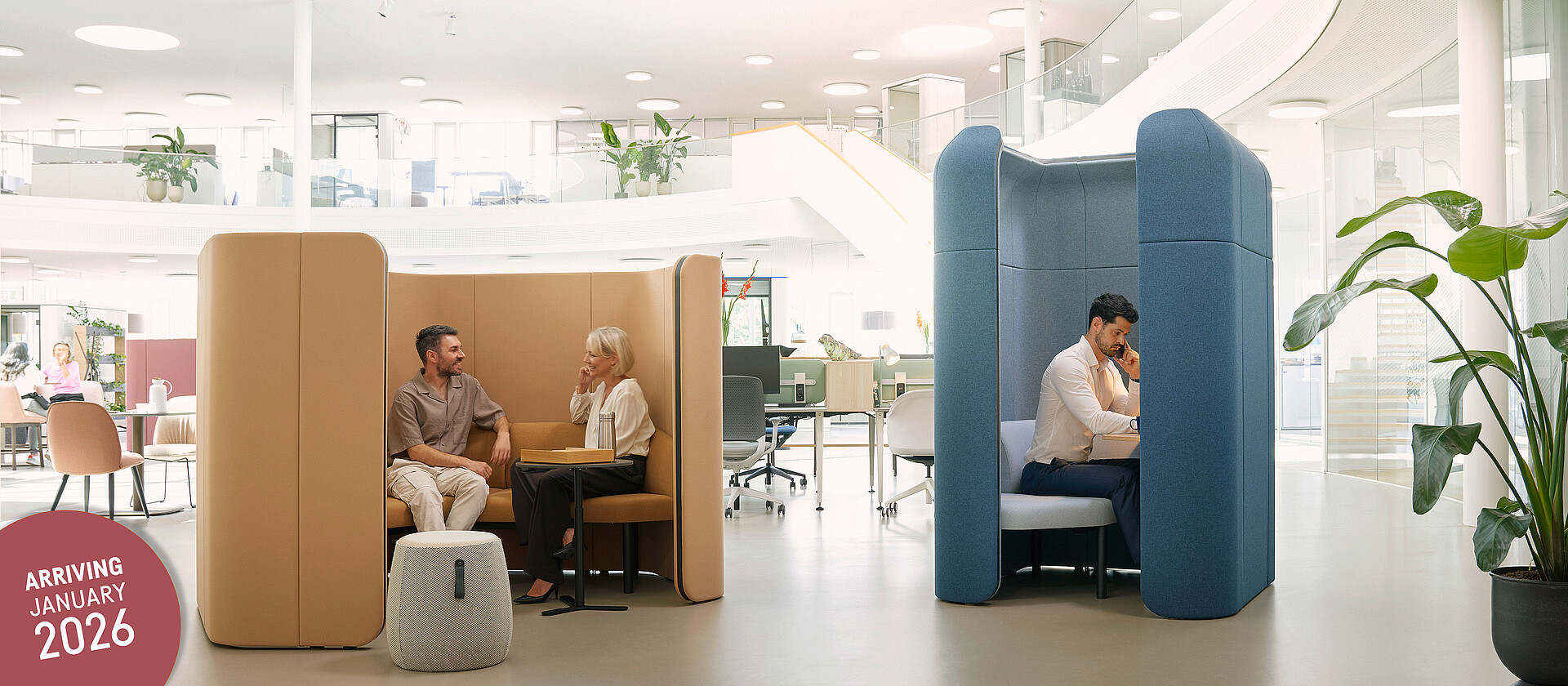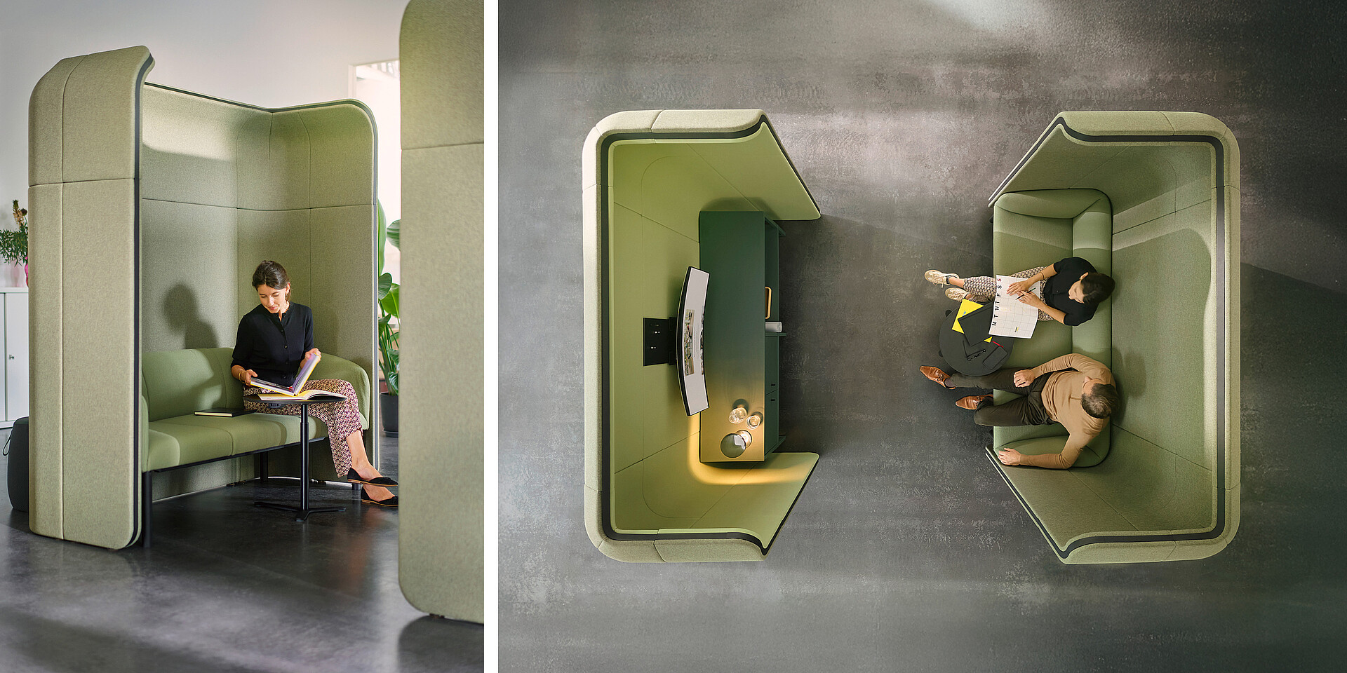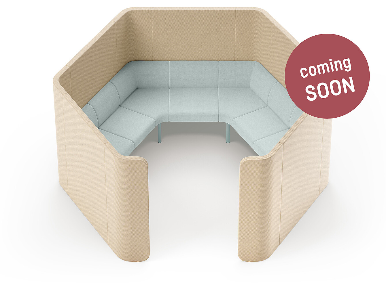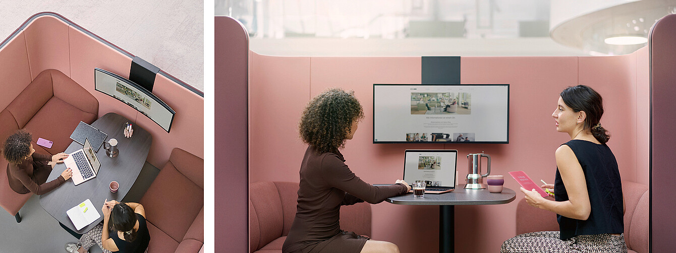 - Enclosures with integrated sofa elements: - Cosy bench integrated into se:hive 90° or 120° module