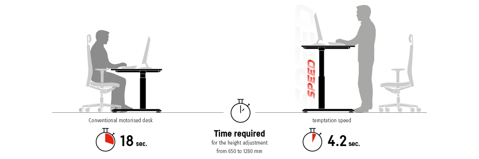 With the height adjustment speed of 150 mm per second, temptation speed is the world’s fastest motorised desk