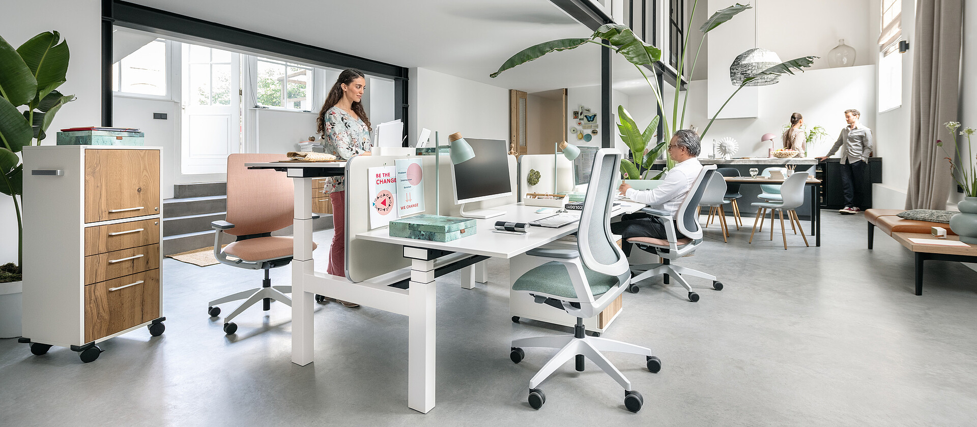 «Bench» doble con ajuste eléctrico de altura para una mayor ergonomía.