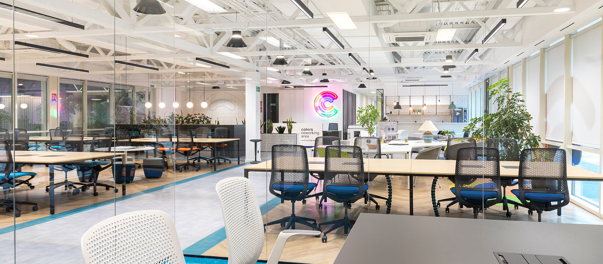 Le co-working chez Colors, dans des dimensions inédites : au San Fernando Business Park à Madrid, sur près de 750 m2, un vaste espace accueille les collaborateurs nomades qui peuvent également utiliser plusieurs salles de réunions. Le coin café et lounge invite à prendre le temps, lors de pauses détente. Cet espace porte bien son nom : chez Colors, la gaieté et la variété sont de mise ; et de bon ton. Avec de larges baies vitrées et des fenêtres surdimensionnées qui laissent généreusement passer la lumière.
