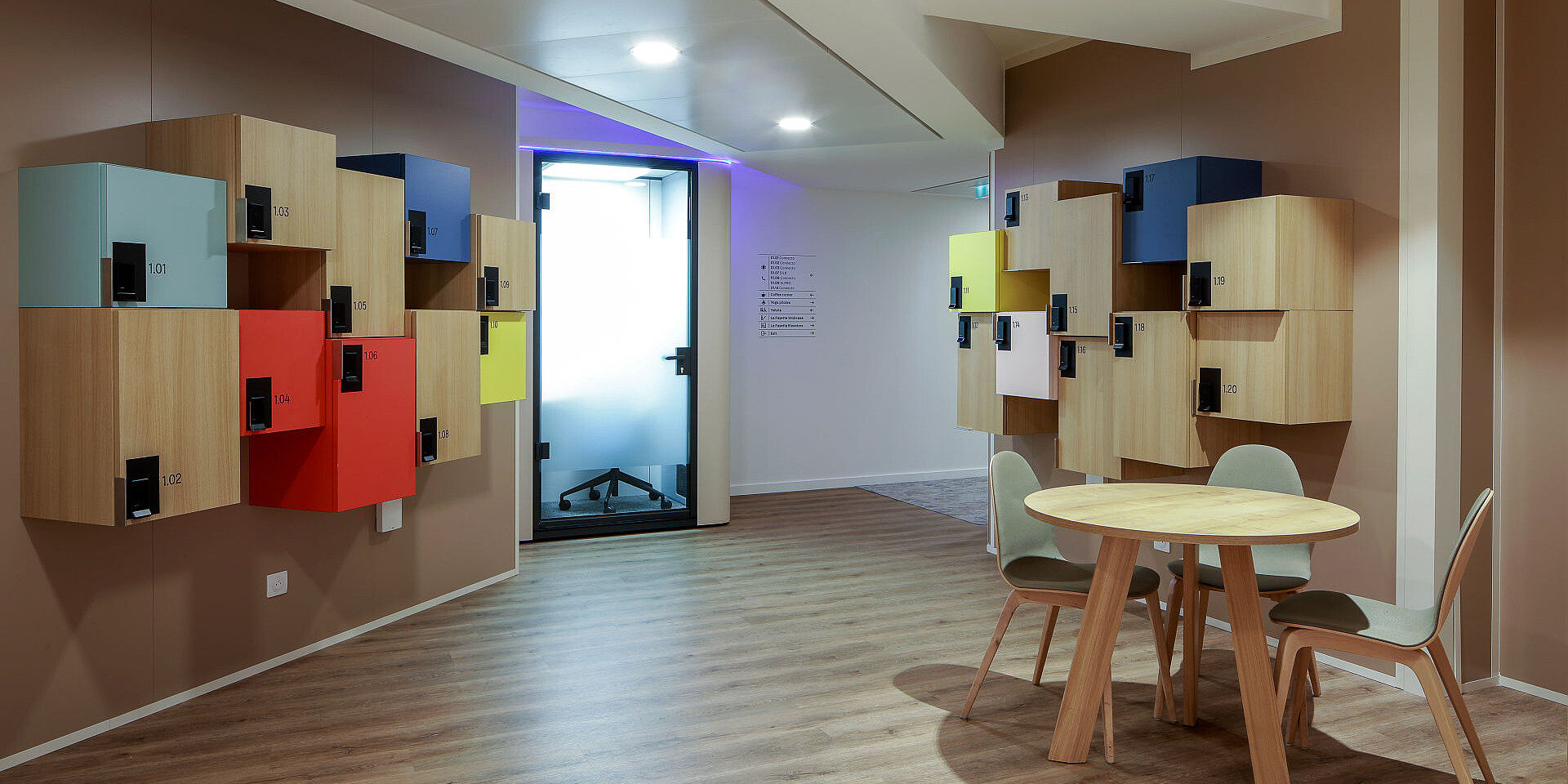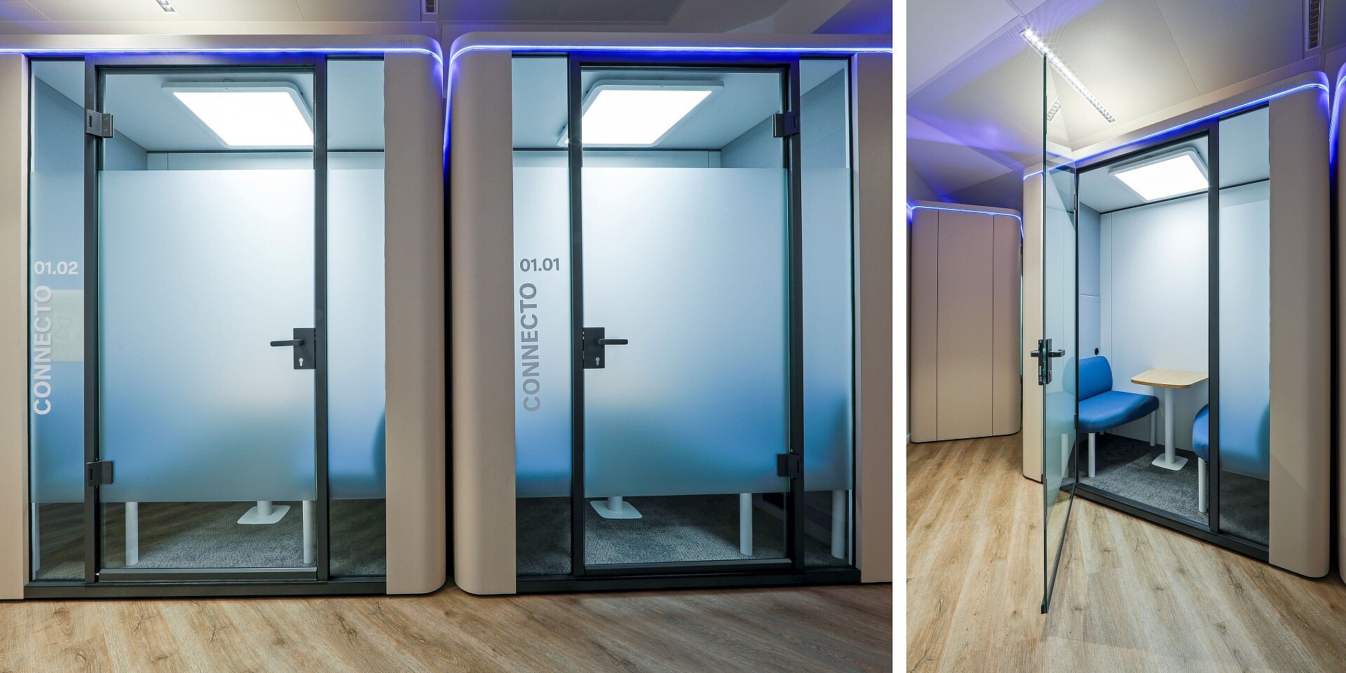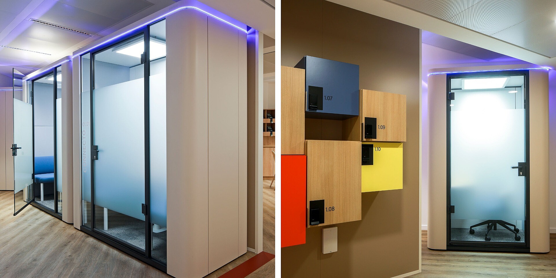 Pour les phases nécessitant une forte concentration et un travail individuel, les collaborateurs disposent de plus de 70 cabines acoustiques se:cube avec système de réservation intégrée. Ces espaces de retrait créent des zones calmes et protégées acoustiquement au sein des open spaces et permettent de travailler sans être dérangé, de tenir des conversations personnelles ou de faire de courtes pauses. Ils instaurent ainsi un équilibre entre ouverture et retrait – un élément central du concept global d’aménagement.
