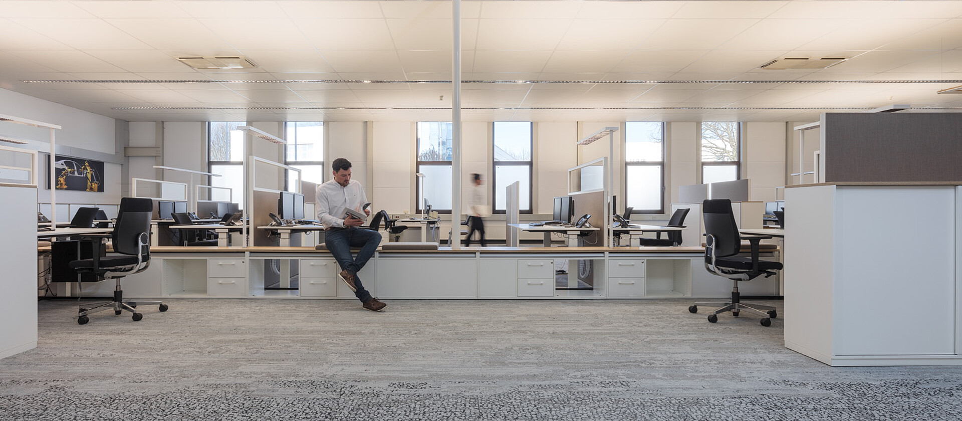 Tout en modernité, l'open space laisse une large place à la lumière – pour une atmosphère des plus agréables. L'espace a été structuré pour répondre à différents besoins. La zone centrale se prête parfaitement aux réunions et autres échanges de courte durée – simples et rapides, notamment aux "high desks". Des écrans ont été intégrés pour isoler phoniquement les espaces et optimiser l'acoustique.