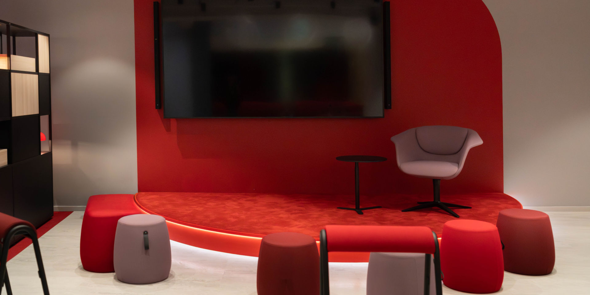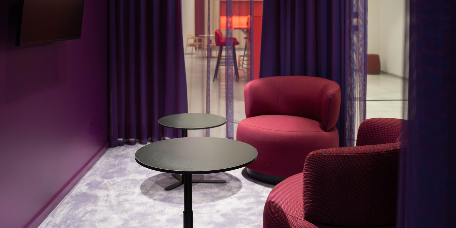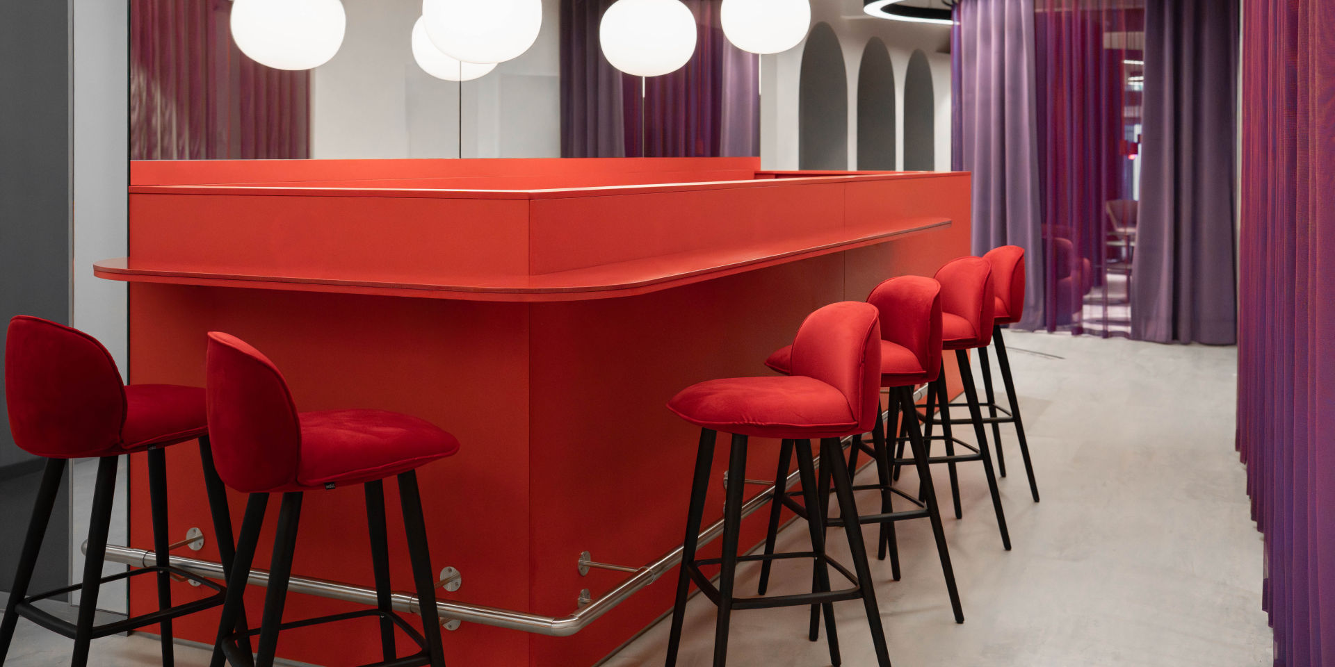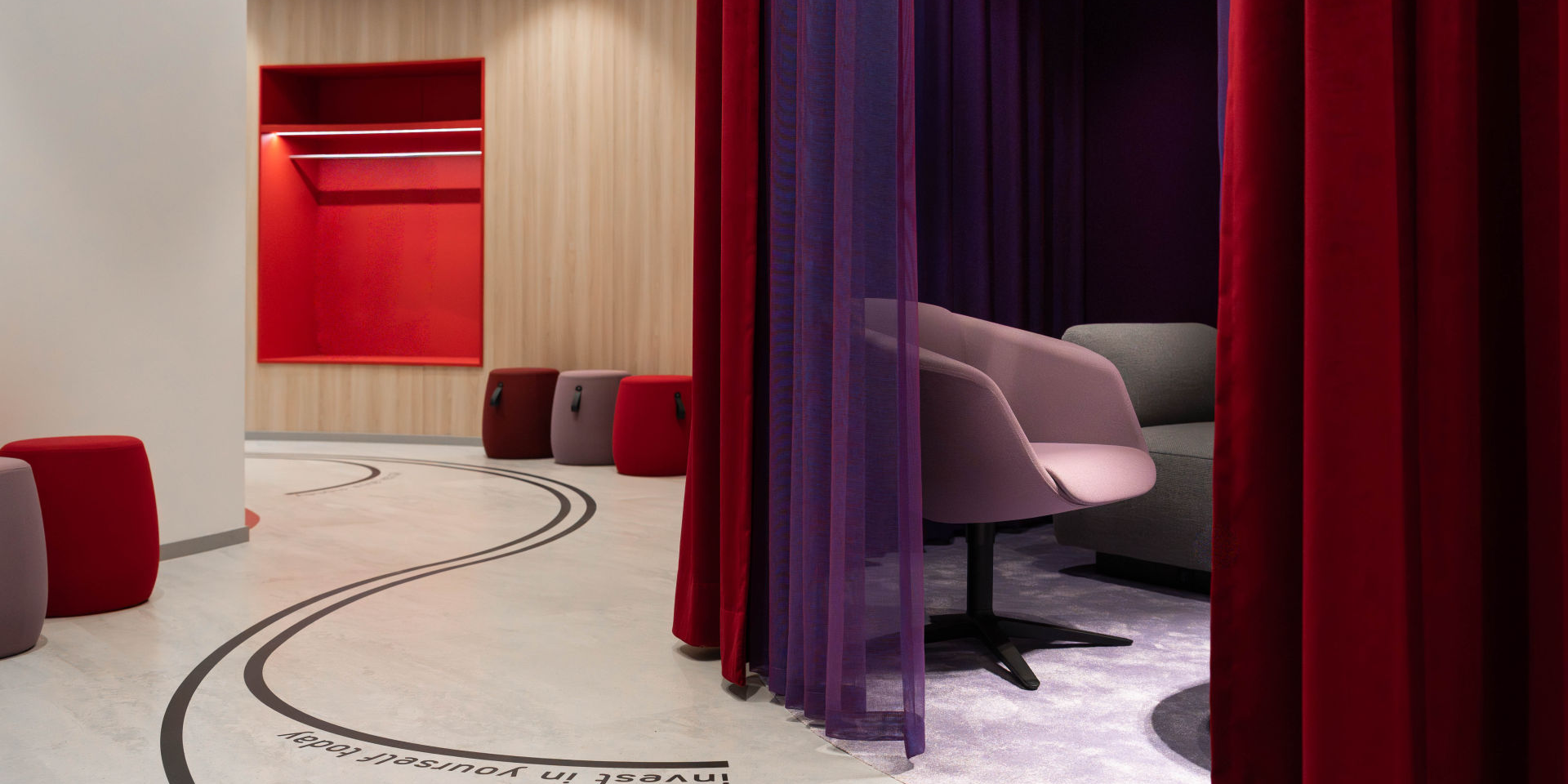 Chez HEY SPARK, les échanges se déroulent côte à côte sur des meubles lounge, et non en face l’un de l’autre derrière un bureau. Les couleurs, matériaux et textures découlent directement de l’identité visuelle de la Junge Sparkasse. L’objectif était de créer une atmosphère chaleureuse, jeune et ludique. Des murs courbes, des îlots de réunion aux contrastes colorés et un zonage délibéré structurent le long plan et créent une succession d’espaces intuitive et reconnaissable, qui suscite la curiosité tout en offrant de la discrétion.