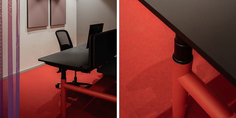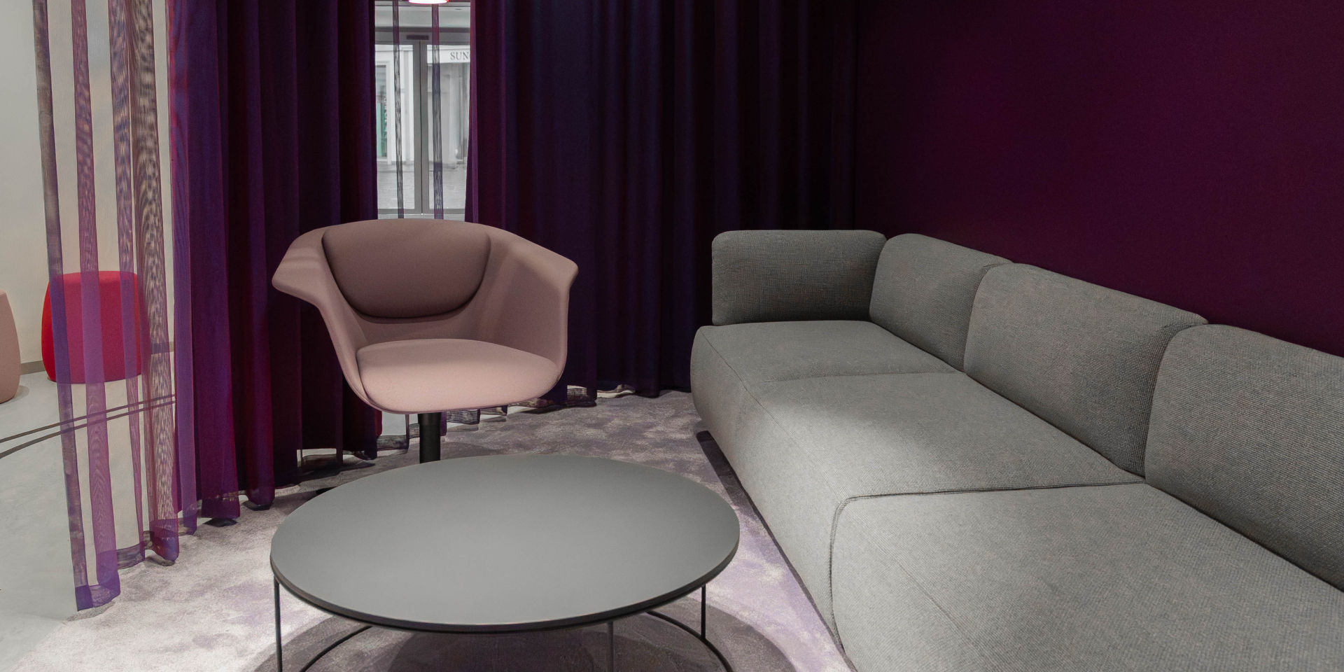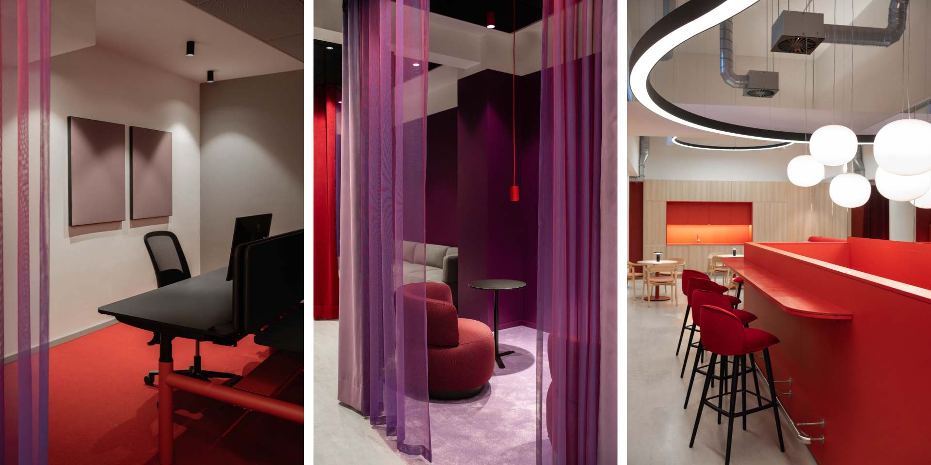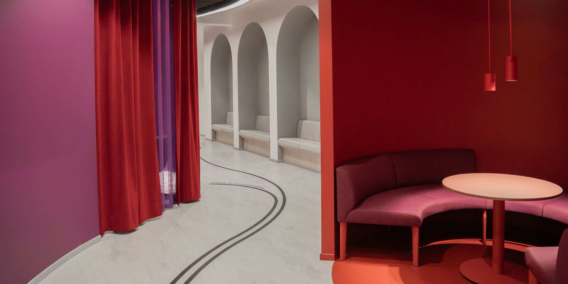 Chez HEY SPARK, les échanges se déroulent côte à côte sur des meubles lounge, et non en face l’un de l’autre derrière un bureau. Les couleurs, matériaux et textures découlent directement de l’identité visuelle de la Junge Sparkasse. L’objectif était de créer une atmosphère chaleureuse, jeune et ludique. Des murs courbes, des îlots de réunion aux contrastes colorés et un zonage délibéré structurent le long plan et créent une succession d’espaces intuitive et reconnaissable, qui suscite la curiosité tout en offrant de la discrétion.