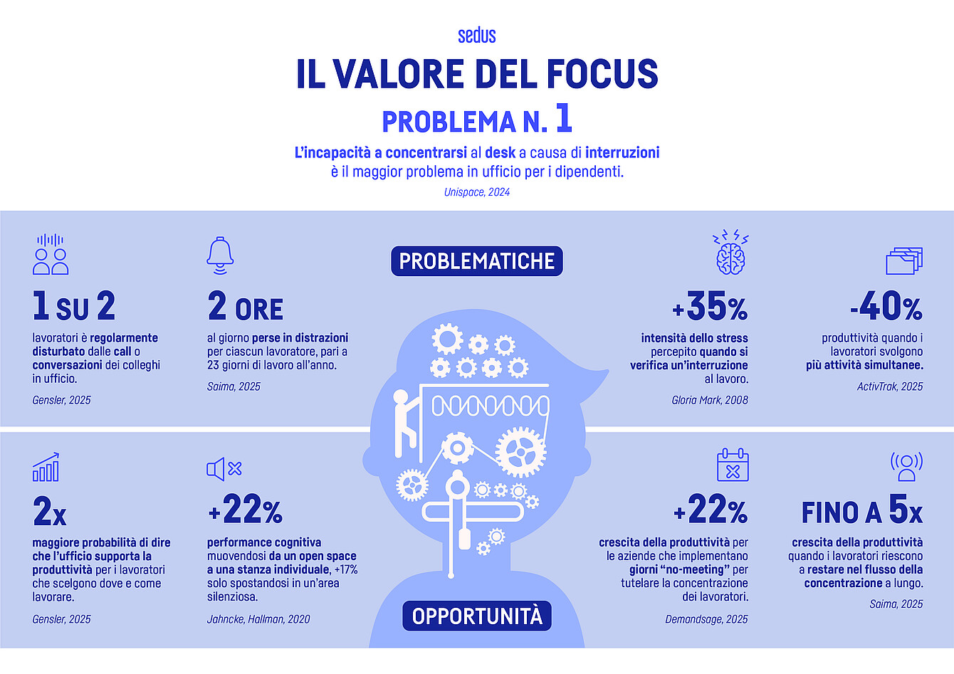 “Il più grande malinteso dell'ultimo decennio in ambito lavorativo è la convinzione che la concentrazione sia semplicemente sinonimo di “meno rumore”. La ricerca dimostra chiaramente che le persone non perdono la concentrazione a causa dei rumori, ma perché non hanno il controllo sul proprio ambiente”, afferma Ernst Holzapfel, direttore marketing di Sedus. “In un’epoca in cui il lavoro è distribuito in molti luoghi, l’ufficio ha bisogno di un compito chiaro. Le neuroscienze dimostrano che è biologicamente quasi impossibile mantenere una concentrazione effettiva per più di quattro ore. Se perdiamo questo tempo in ufficio, l’azienda perde la sua fonte di energia più preziosa."