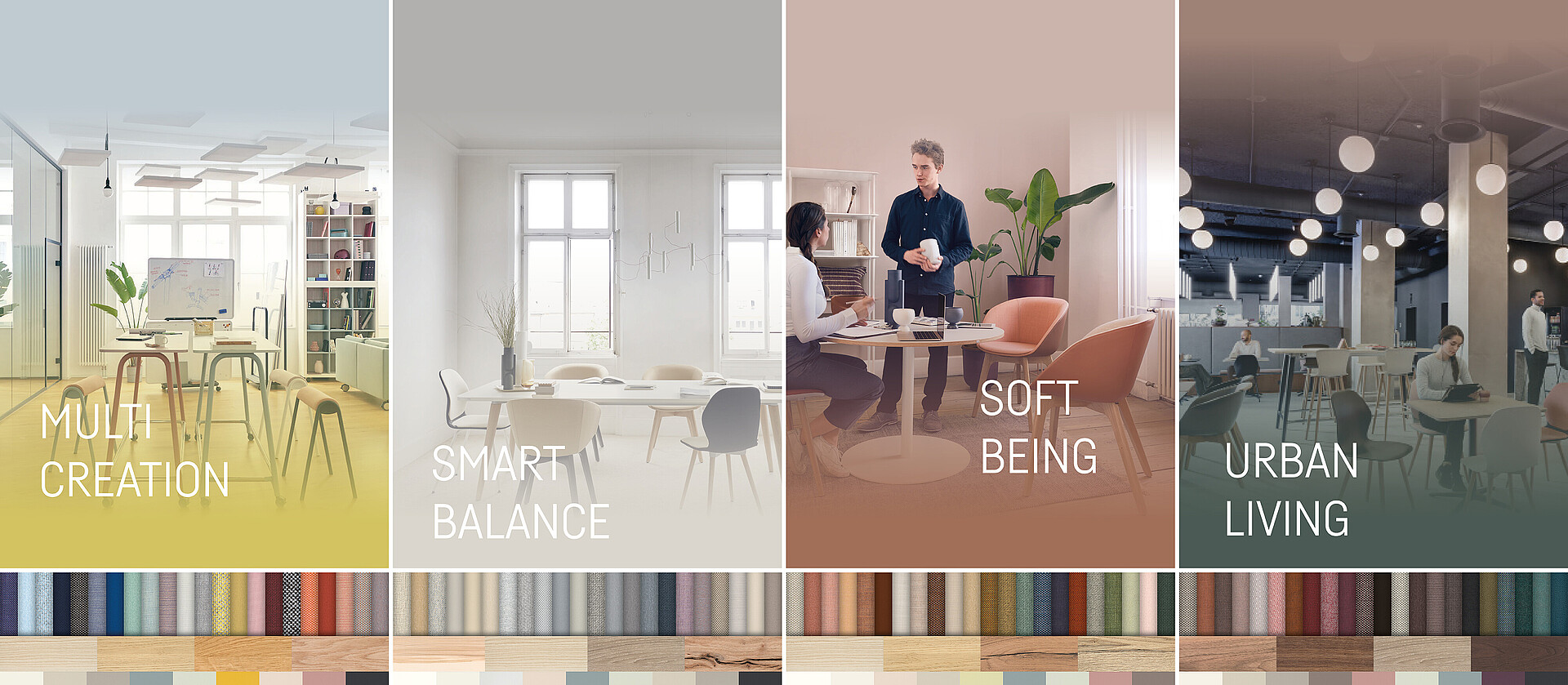 Grazie alle numerose possibilità di combinazione, i colori, i tessuti e le superfici sono in grado di creare interi ambienti e universi lavorativi. Se impiegati con il giusto tocco e in armonia con l'ambiente circostante, questi elementi possono dar vita a luoghi molto speciali, dove le persone si sentono a proprio agio e lavorano in modo efficace. Perché non c'è solo il bianco e nero: i colori hanno il potere di creare uno stato d'animo positivo e di incidere sull'atmosfera. In tal modo, scegliendo con cura le armonie cromatiche e le combinazioni, l'ufficio può trasformarsi in un luogo di benessere.