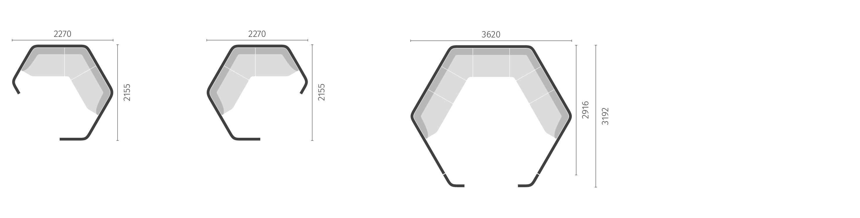 Nella variante vuota, se:hive single può essere utilizzato in diverse misure e forme come soluzione aperta. In questo modo, il sistema modulare può essere utilizzato per diversi stili di lavoro e concetti di ambiente all’interno di un open space.