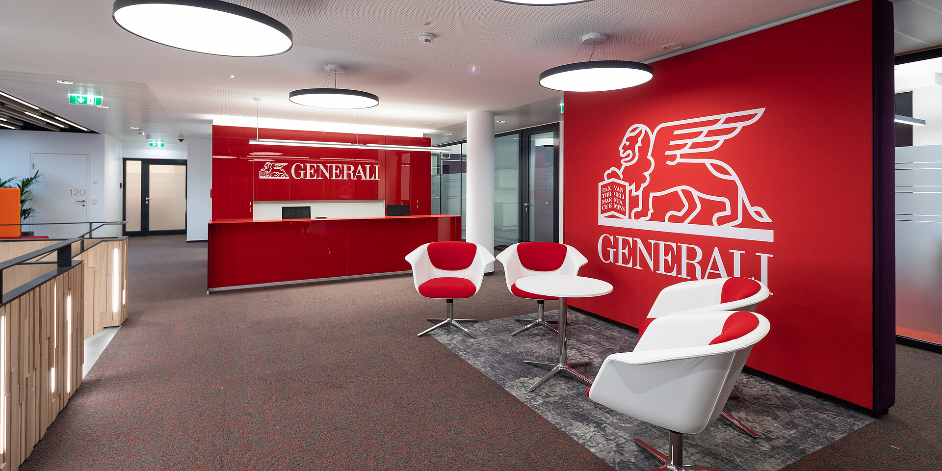 Il nuovo edificio di Generali a Klagenfurt ospita 128 postazioni di lavoro, oltre a sale riunioni e aree relax. Questi ambienti sono dotati di high desk che permettono di passare dalla posizione seduta a quella in piedi. Il rosso aziendale è usato in varie intensità e declinazioni.